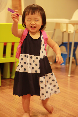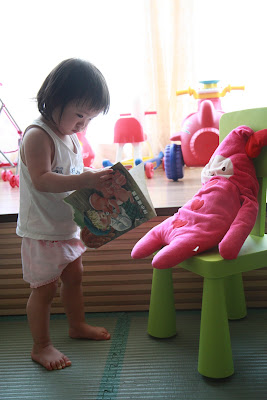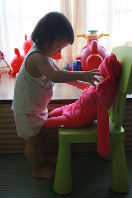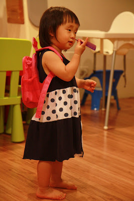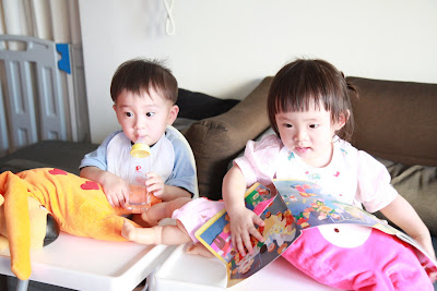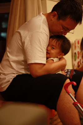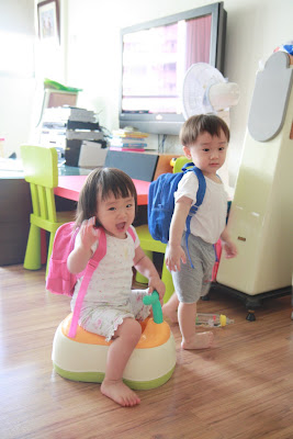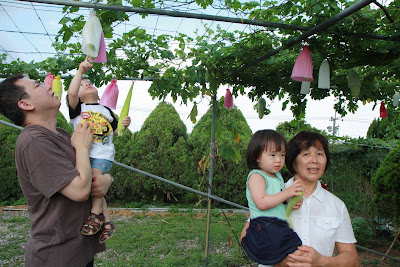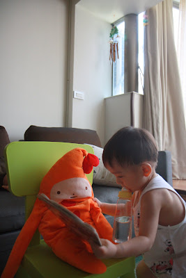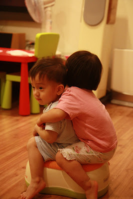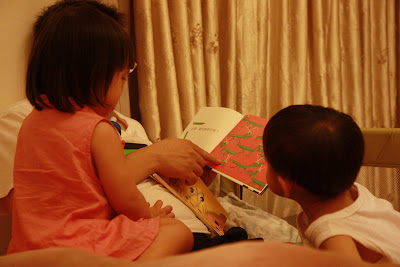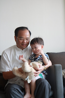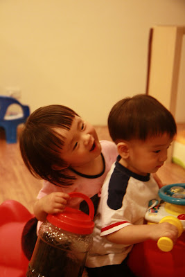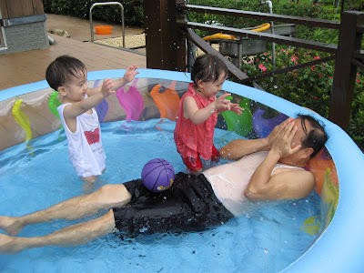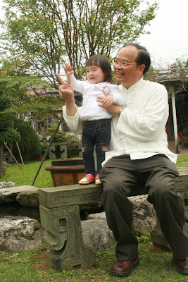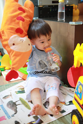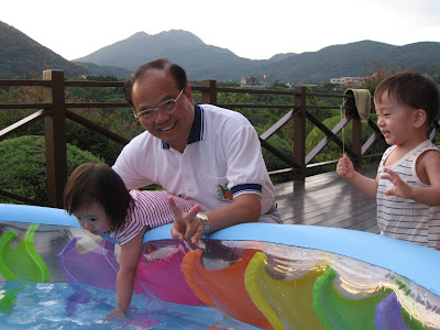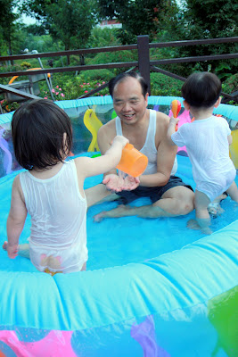 原本以為事情告一段落,今天回娘家,路上問說去找阿公阿嬤玩好不好,源源也很開心說好,剛好回家時爸媽有事不再家,源源也很開心的在娘家玩,我讓孩子先下水玩,玩到一半,阿公阿嬤回家,開心的跟寶貝們打招呼,源源又想起那天的彆扭,開始鬧了起來,不給抱,一直拿冷屁股去貼阿公阿嬤的熱臉,拉我的手t說要回家,鬧個不停,這是什麼複雜的情緒,吃醋吃得很酸耶,最後阿公只好又老萊子上身,綵衣娛"孫",連哄帶騙,裝哭的博得小源的同情,也給小源一個好高的台階下,源源又跟阿公和好如初,只是這孩子的敏感,如何處理適當是我們父母的大課題!!