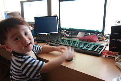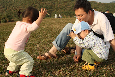 今天,源源著實的鬧了一頓彆扭,起因是星期六,趁颱風未進來前,我們跟阿公阿嬤帶著寶貝們去慈湖玩,源源很喜歡阿公阿嬤,原本在會合的路上源源唱唱跳跳的很調皮,看到阿公阿嬤坐進車來就裝乖,裝文靜(源遇到喜歡的人都會這樣),邊偷笑,邊注意阿公在幹嘛!源源是個被動的孩子,喜歡人主動關心與招呼,即便很喜歡對方,都很含蓄的展現自己的喜歡,但敵不過熱情的妹妹,沿途中阿公阿嬤跟妹妹玩的一路上滿是笑聲,焦點就不在他身上,後來就開始一點一滴的展現不開心的表情,最後就鬧起脾氣來了,番到一個不行,最後在回家的電梯上被爸爸打了一下屁股,整個崩潰!